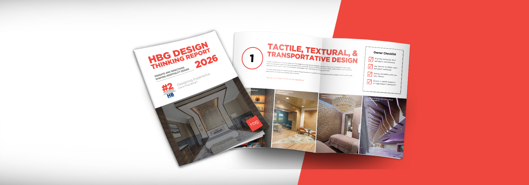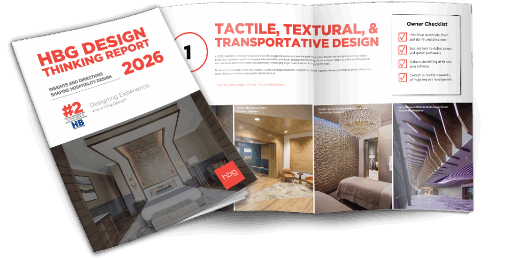 In 2026, hospitality design is all about creating immersive, memorable experiences that resonate with guests long after they leave. From boutique hotels to large-scale resorts and entertainment destinations, the bar for innovation has never been higher. HBG Design, ranked #2 Hospitality and Entertainment Design Firm in the U.S., by Hotel Business Magazine for 2026, has decades of experience translating industry insights into transformative guest experiences. This year, our team has identified the design thinking that will define hospitality experiences and drive both engagement and operational success. You can download the full design thinking report here.