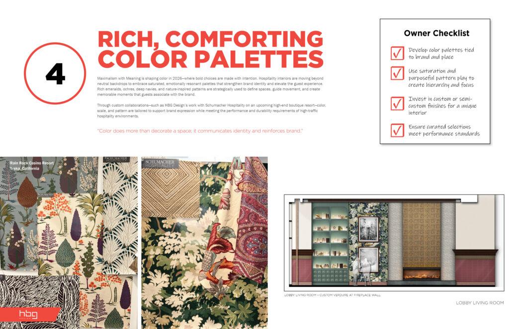 Color and material storytelling are taking center stage. For an upcoming boutique resort lobby, HBG Design collaborated with Schumacher Hospitality to transform iconic residential patterns into hospitality-grade fabrics and wallcoverings. Custom applications—from vibrant lobby wallcoverings to rooftop restaurant fabrics—combine durability with artistry, craft, and narrative inspiration drawn from the surrounding woodland landscapes and local industrial heritage.