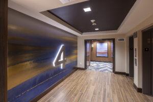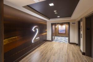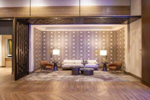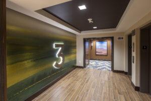 Design elevation begins well before guests enter their rooms. Elevator lobbies introduce a subtle dusk-to-dawn progression, expressed through shifting wallcovering tones that guide guests upward through the hotel tower. Guestroom corridors continue this narrative with soft, ambient lighting and a warm, textural palette—creating a sense of calm and anticipation before guests even open their doors.