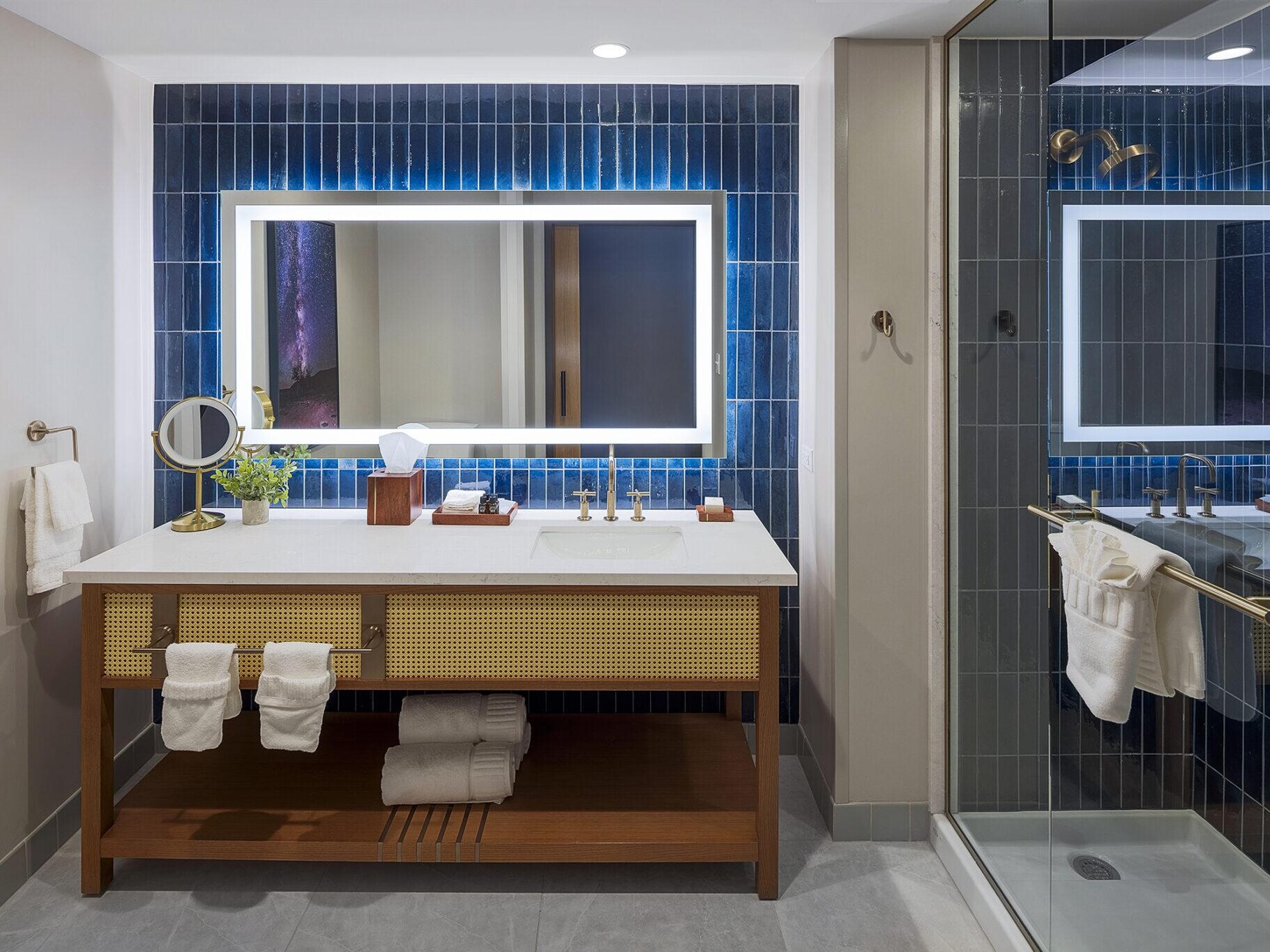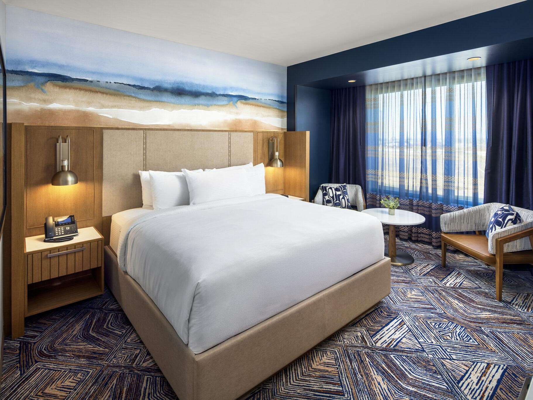 Inspired by the surrounding prairie landscape, the new hotel tower and interiors offer a contemporary expression of warmth, light, and regional character. A subtle “dusk-to-dawn” concept informs the elevator lobbies and corridors through shifting tones and soft ambient lighting, while guestrooms pair neutral foundations with bright accents drawn from Oklahoma’s open skies and sunlit plains. Lighting becomes a defining design element throughout the property—from the cross-weave illumination animating the exterior façades to the glowing geometric chandelier in the lobby atrium—guiding guests seamlessly through moments of calm, energy, relaxation, and anticipation.