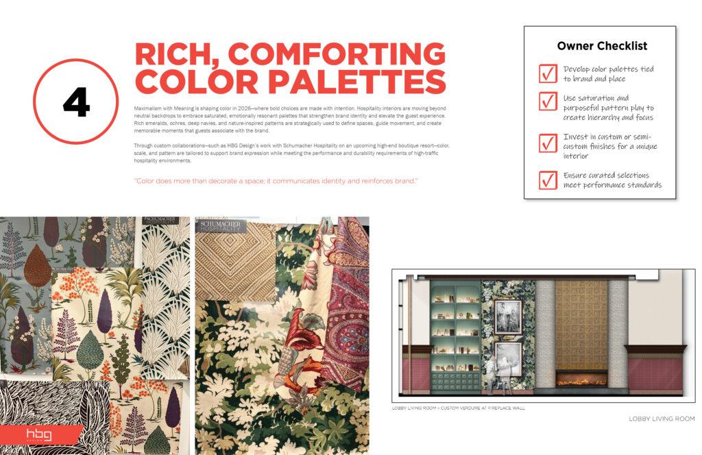 Color and material storytelling are taking center stage. For an upcoming boutique resort lobby, HBG Design collaborated with Schumacher Hospitality to transform iconic residential patterns into hospitality-grade fabrics and wallcoverings. Custom applications—from vibrant lobby wallcoverings to rooftop restaurant fabrics—combine durability with artistry, craft, and narrative inspiration drawn from the surrounding woodland landscapes and local industrial heritage.