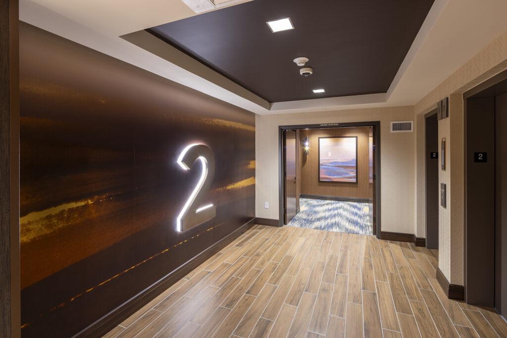 The guest experience begins well before the room door opens. Elevator lobbies introduce a subtle dusk-to-dawn progression through shifting wallcovering tones, guiding guests vertically through the tower and reinforcing a sense of journey and arrival. Guestroom corridors continue this narrative with ambient lighting and a warm, textural palette—setting a calm, welcoming tone that supports guest satisfaction and wayfinding.