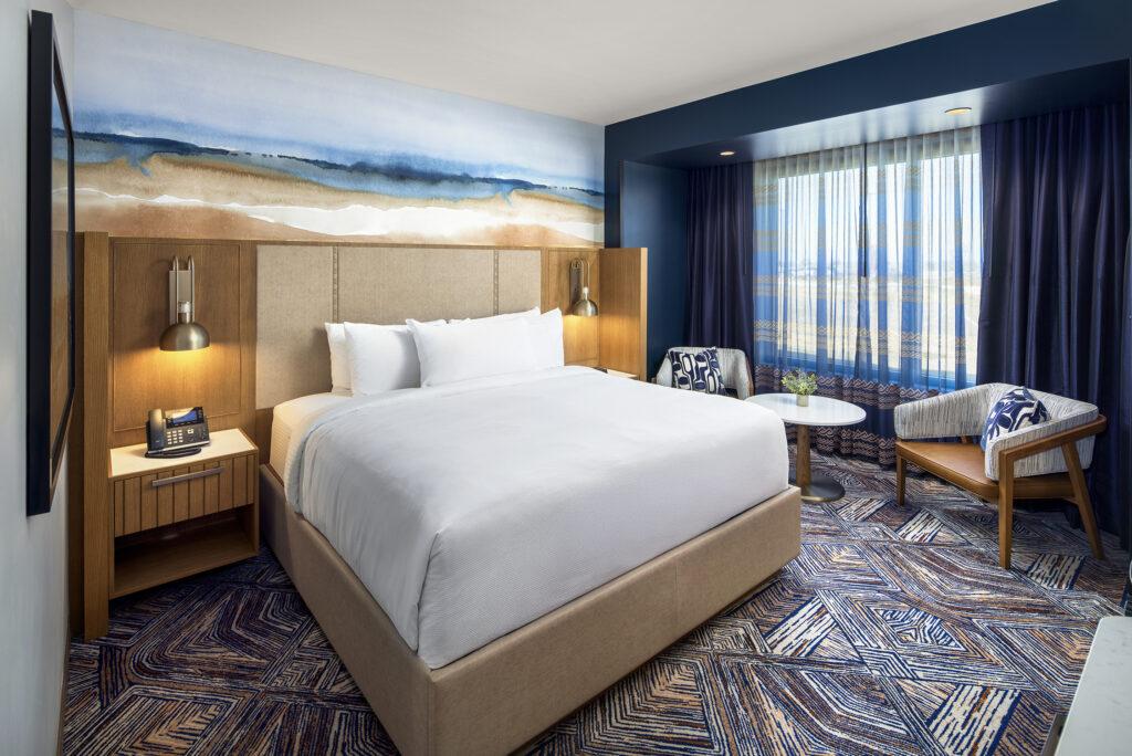 Accent walls in deep, atmospheric blue tones add contrast and visual interest, framing seating areas and window views while giving the rooms a stronger sense of identity. Layered window treatments—sheer panels paired with blackout drapery—offer guests control over light, privacy, and comfort, a critical expectation in resort and casino hospitality.