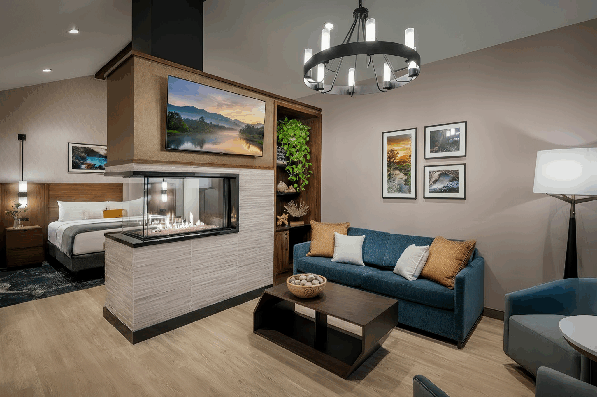 Reserved for the resort’s most important patrons, the suite offers a private elevator and dramatic countryside views. Two-story living spaces, walnut herringbone floors, radiant heating, and a bespoke crystal chandelier heighten the sense of privilege. A sculptural floating stair adds distinction and artistry. With INNCOM smart technology, drapery and lighting respond seamlessly, making the guest experience effortless and striking.