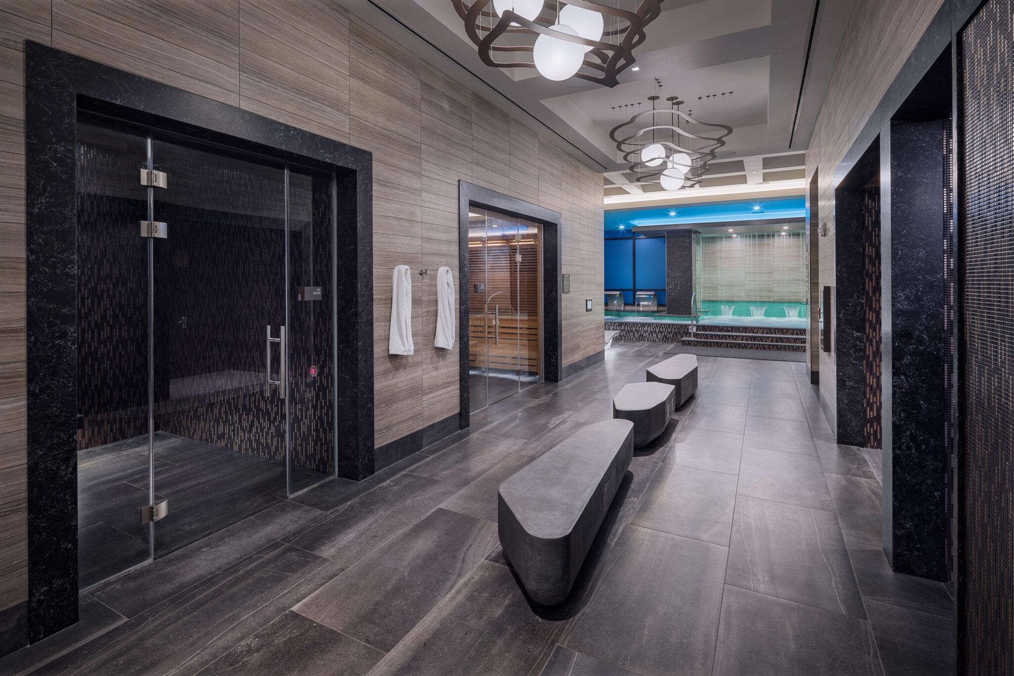 The new 230,000 square foot Spa Tower, featuring a 26,000 square foot European-style spa, has become a popular destination for wellness enthusiasts. “The spa offers communal experiences, including a VIP Party Suite and coed aqua thermal area with a hydrotherapy tub and ambient experience shower,” says Landon Shockey, Lead Interior Designer at HBG Design.